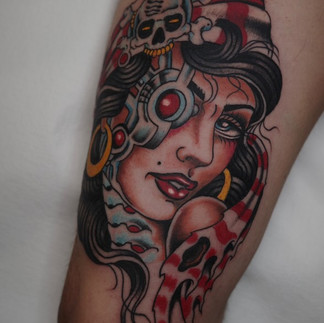 Michelle Nowhere is a tattoo artist and painter in Italy. Her tattoo style is traditional and colorful with American influences. If you like her tattoos as seen in the photos below, book a session with her by contacting her on Instagram ( @michellenowhere ).